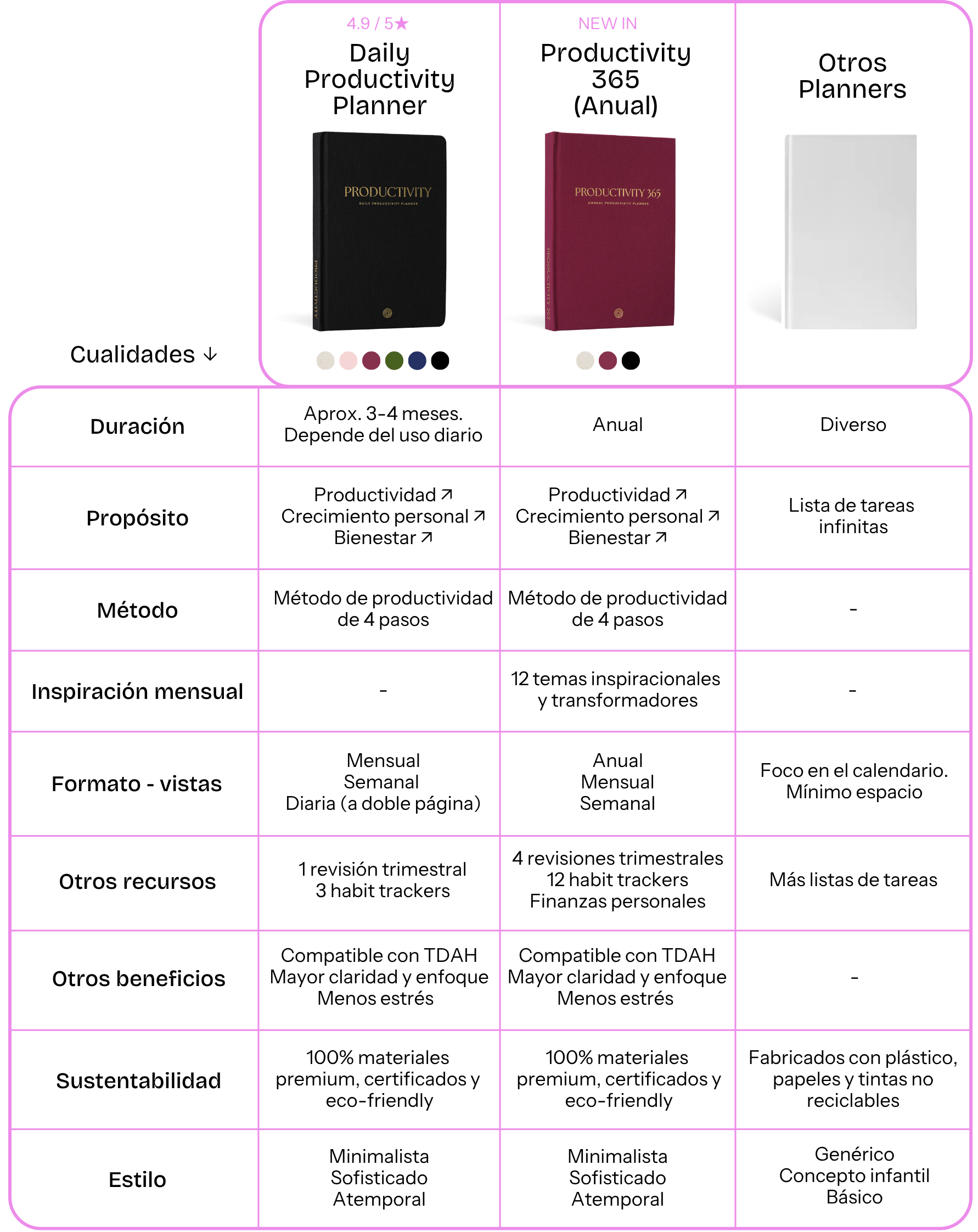 Descubre qué planner se adapta mejor a ti y a tus necesidades con esta tabla comparativa. Aquí analizamos nuestros dos planners disponibles, Daily Productivity Planner y Productivity 365, según su duración, propósito, método, vistas y mucho más.